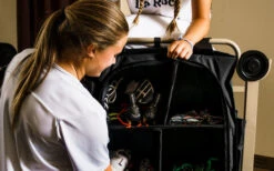 Mit robustem und schmutzunempfindlichen Bezug, Moskitogaze in der Rückwand und Sichtfenster in der Vorderwand. Dank der höhenverstellbaren Füße können Bodenunebenheiten problemlos ausgeglichen werden. Inklusive Tragetasche und Ablageplatte oben.